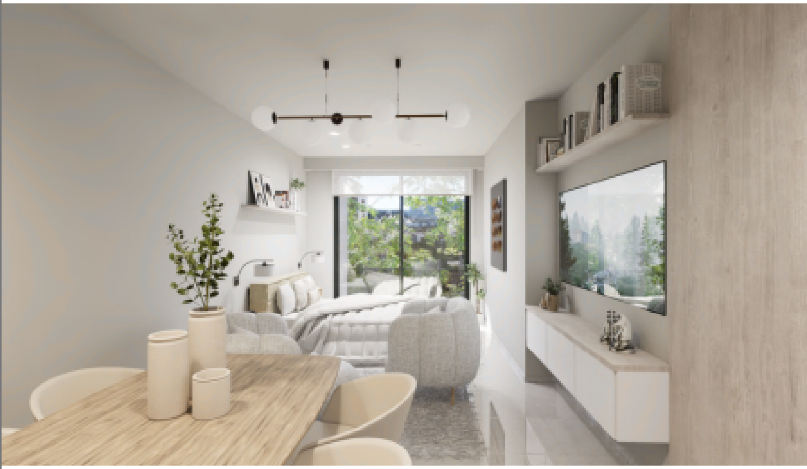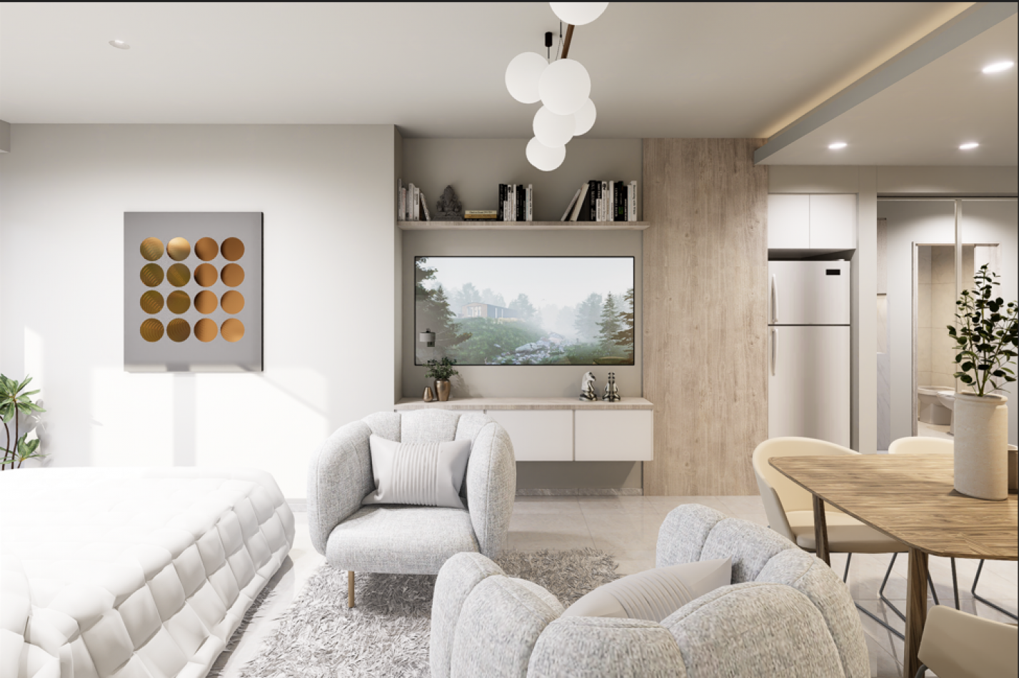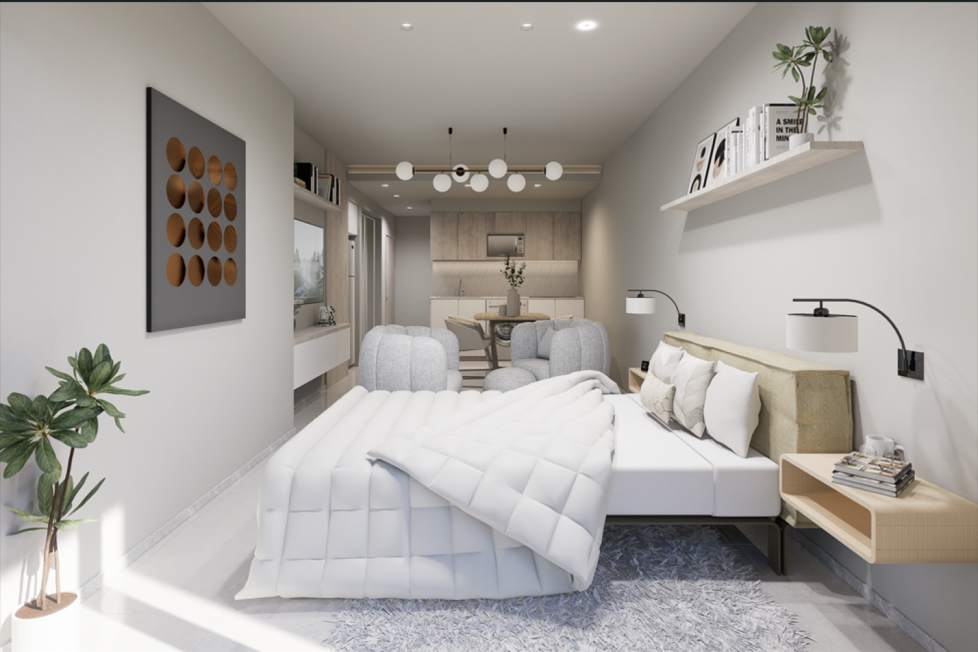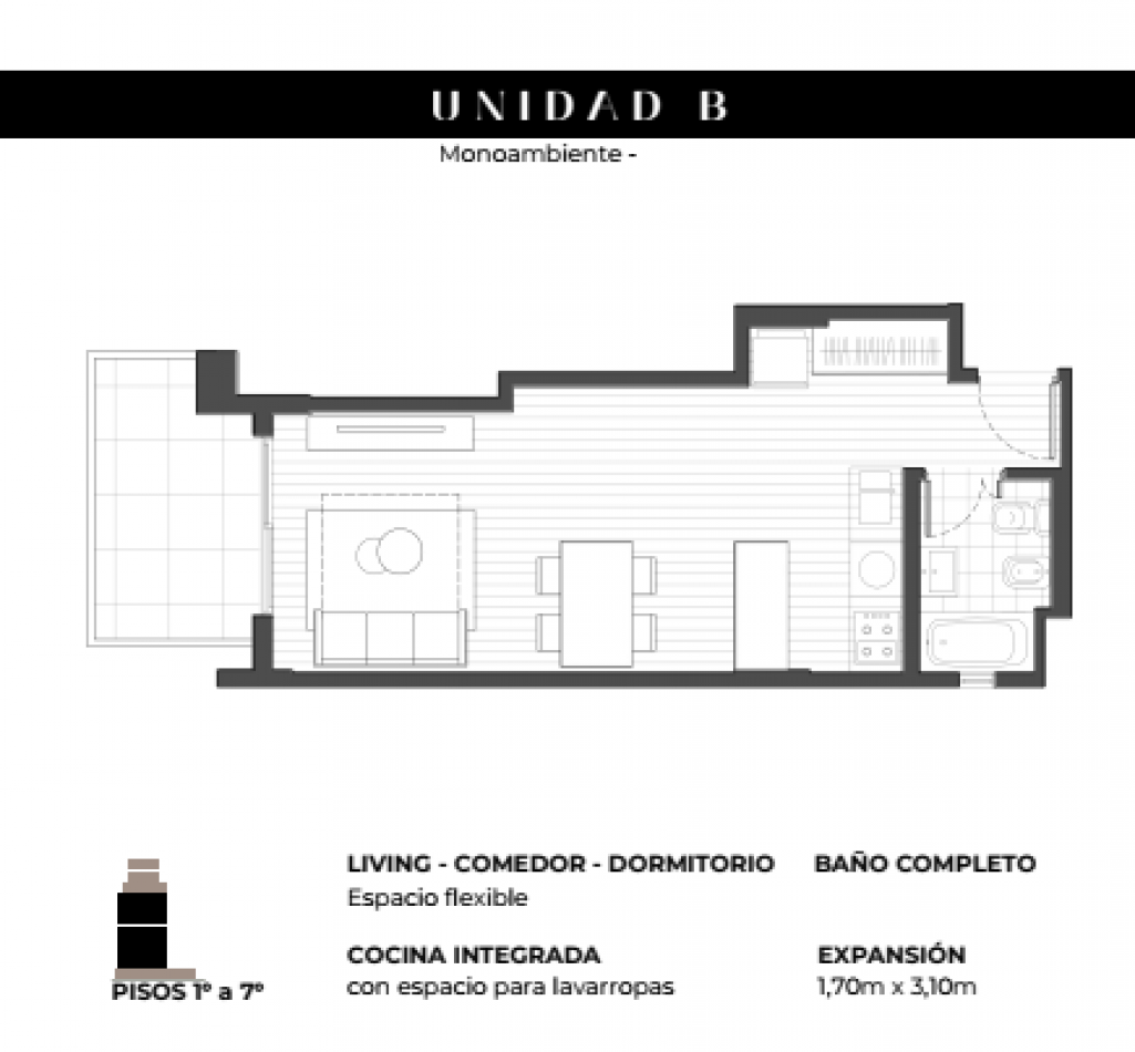 Monoambiente Studio Clásico Divisible de 41.50 m2 al frente con balcón (Depto Tipo B) = La Unidad B es un Studio de dimensiones generosas (41,50 m² totales) diseñado para quienes buscan amplitud y confort en un solo ambiente. Moderna cocina americana con alacenas y bajo mesada con espacio para lavarropas y baño completo. instalaciones y equipamiento de calidad. Placard con puertas corredizas. Balcón en vidrio y aluminio.