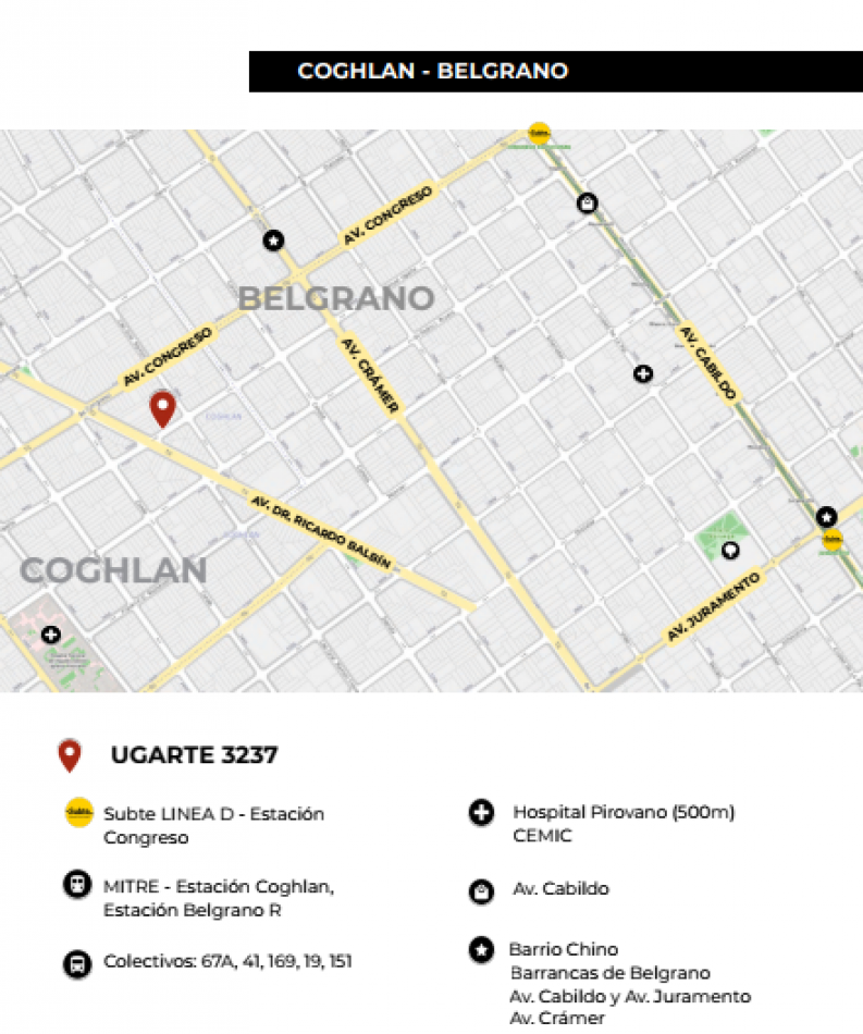 Arterias Principales: Ubicación clave cerca de Av. Dr. Ricardo Balbín, Av. Crámer, Av. Congreso, Av. Cabildo y Av. Juramento, facilitando el movimiento vehicular hacia cualquier punto.
