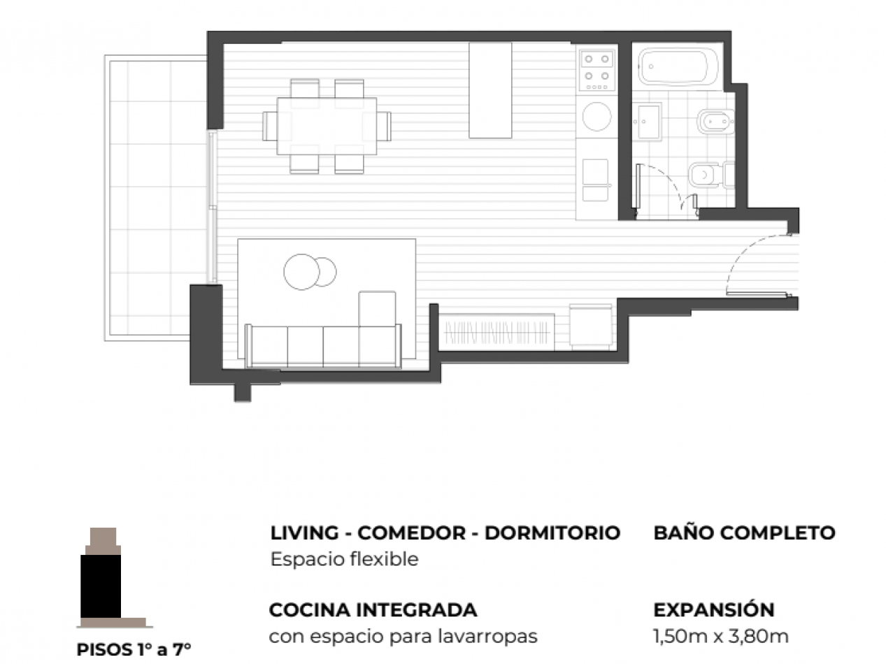 Monoambiente Studio Clásico Divisible de 41.50 m2 al frente con balcón (Depto Tipo lOFT ("A") = La Unidad A es un Monoambiente apaisado de dimensiones generosas y de una disposición cuadrada con un balcón mas grande que los de monoambientes clásicos (43.50 m² totales) diseñado para quienes buscan amplitud y confort en un solo ambiente . Moderna cocina americana con alacenas y bajo mesada con espacio para lavarropas y baño completo. instalaciones y equipamiento de calidad. Placard con puertas corredizas. Balcón en vidrio y aluminio.