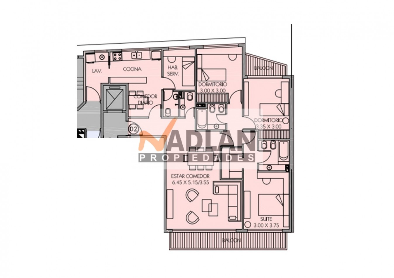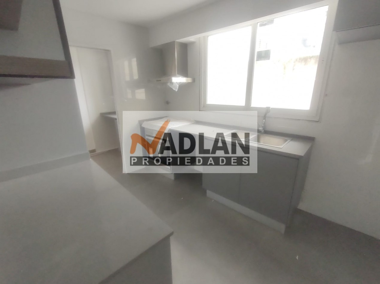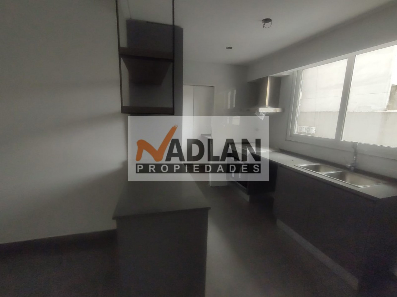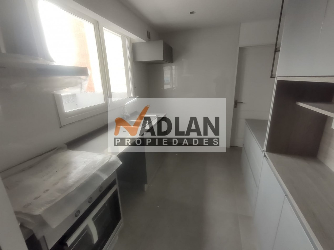 El departamento posee un gran estar comedor al frente con toilette de recepción y amplios ventanales al balcón corrdio, una amplia cocina con comedor diario, lavadero independiente y dependencia de servicio, tres dormitorios, siendo el principal una suite con baño y vestidor completo y con puertas espejadas. Además, cuenta con un segundo baño completo con hidromasaje, que complementa el área de uso común y para los otros dormitorios que también tiene amplio placard con puertas espejadas. La cocina, independiente y ventilada a la cual también se accede por la puerta de servicio , está equipada con muebles de alta calidad, griferías monocomando
